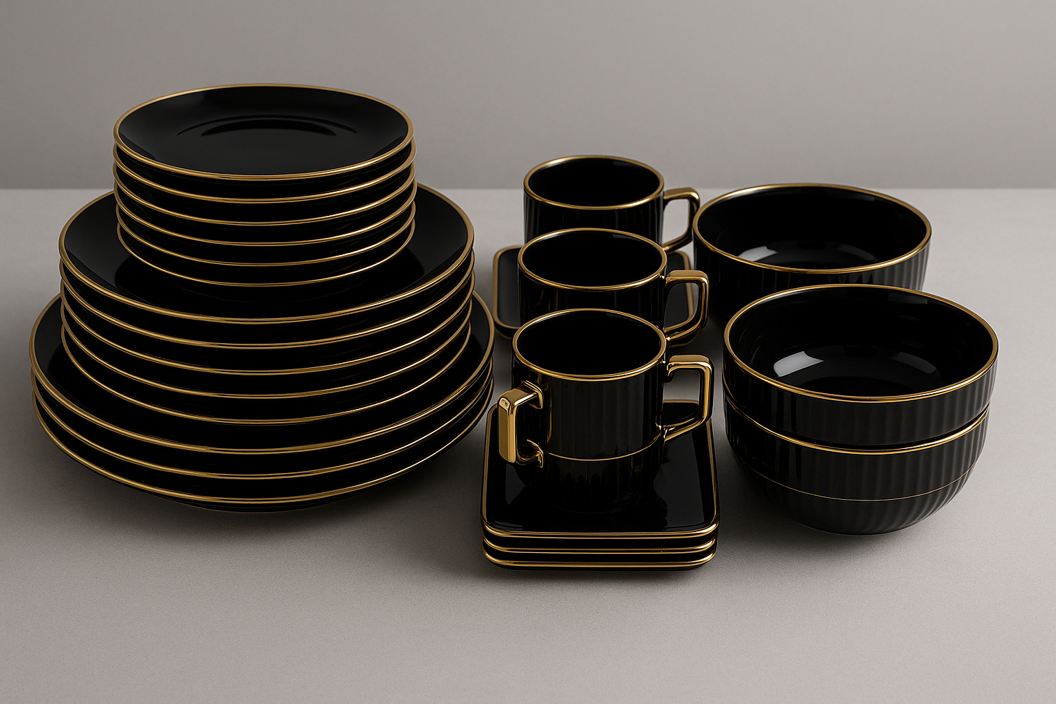 Elevate your dining experience with the Aura 52-piece porcelain dinner set. Designed in elegant black with a gold trim, this set blends luxury and functionality—perfect for modern homes or gifting.